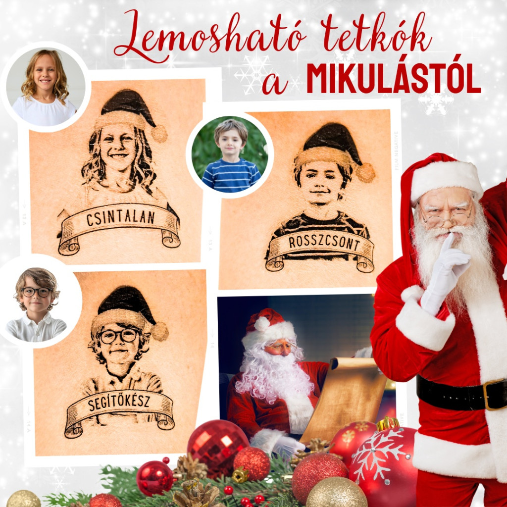 Ezek az egyedi, ideiglenes tetoválások a gyermekek fényképei alapján készülnek, így a kis lurkók saját arcképei kerülnek a tetkókra egy Mikulás sapkával a fejükön és egy jelzővel, hogy hogyan is viselkedtek az adott évben (pl. csintalan, huncut, komisz, rosszcsont, angyali stb.)