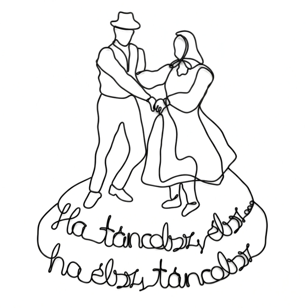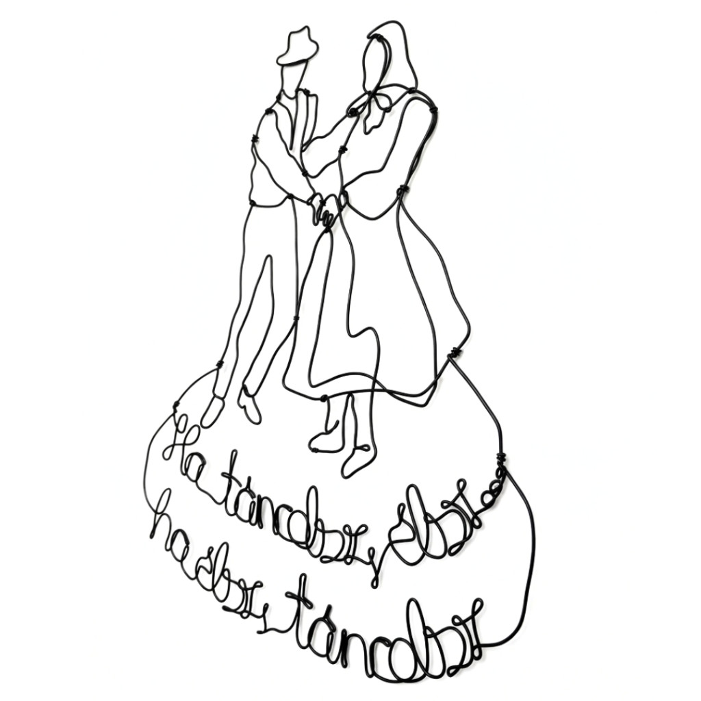 Ez a kézműves drót falikép nem csupán egy dísztárgy, hanem egy vallomás a tánc és az élet öröméről.