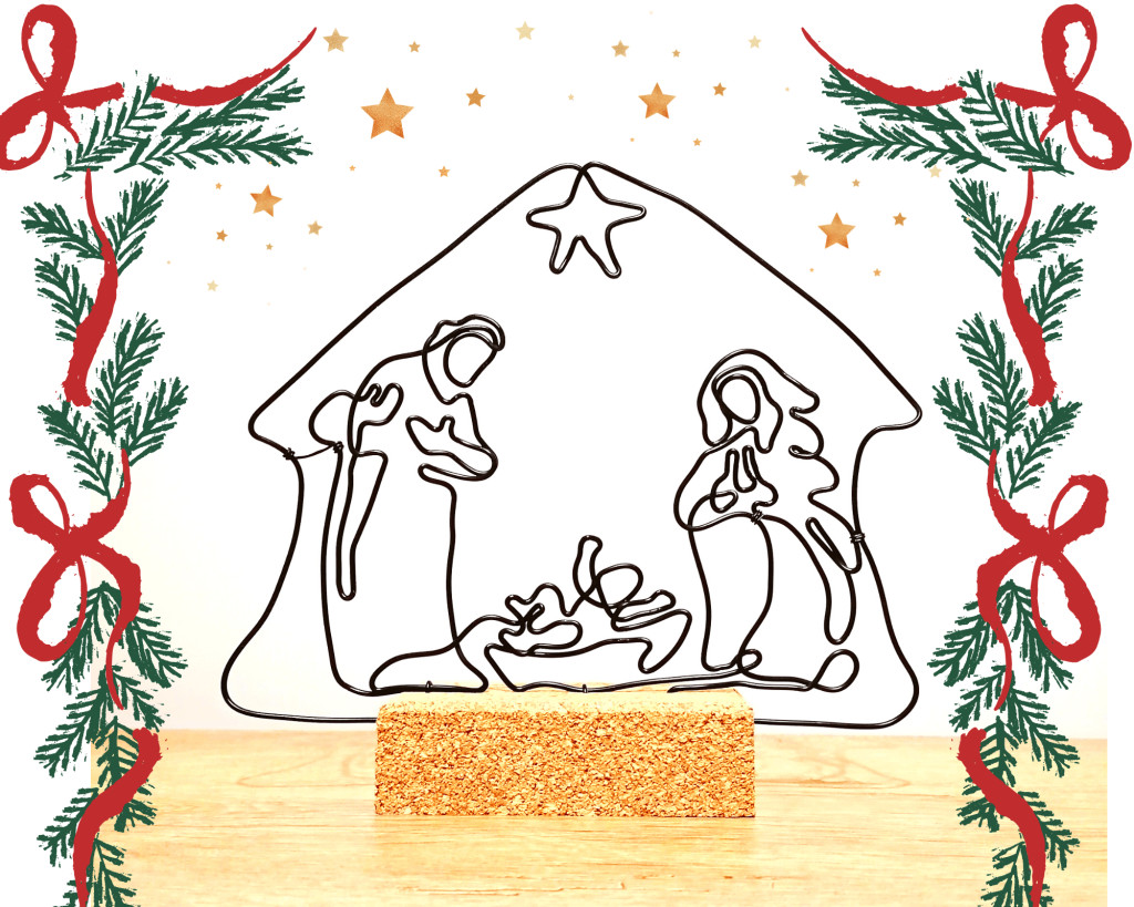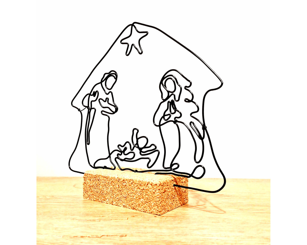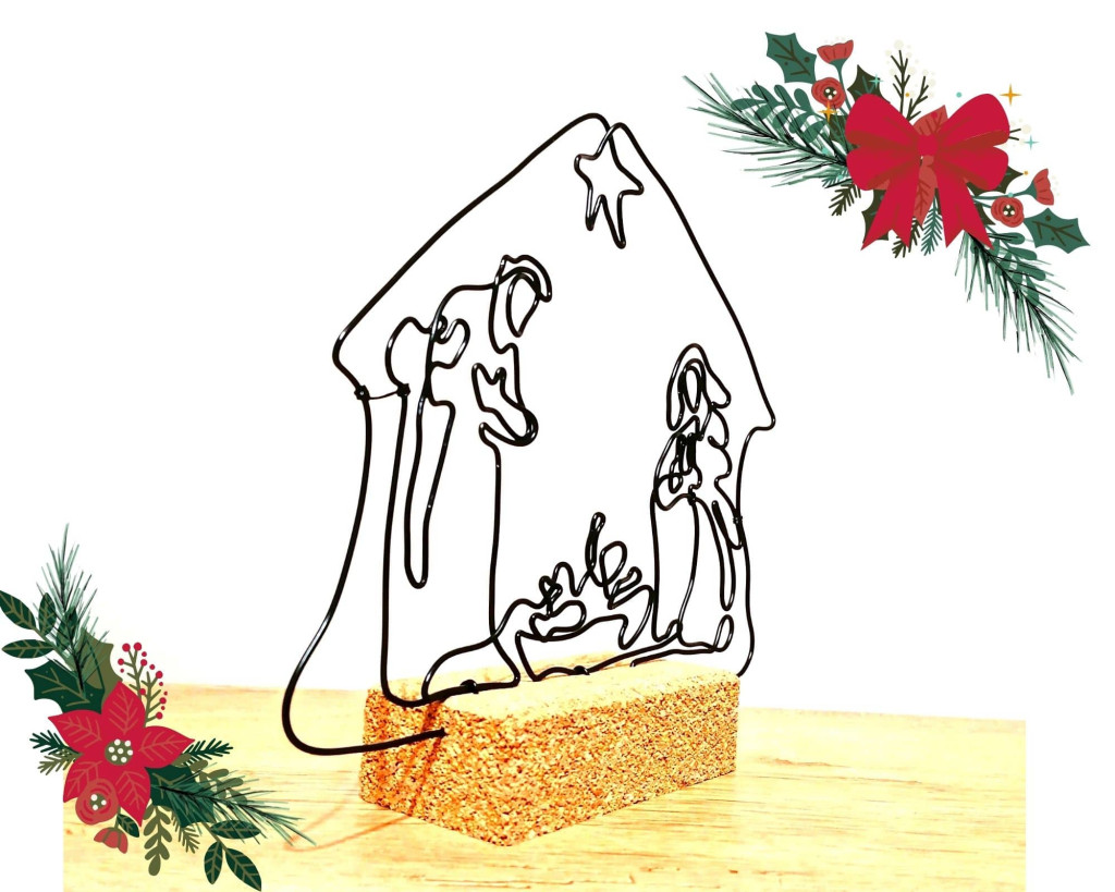 Ez a kézzel hajlított drótból készült betlehemes szobor a karácsony legszebb üzenetét hordozza: a szeretet, a béke és a család meghitt egységét.