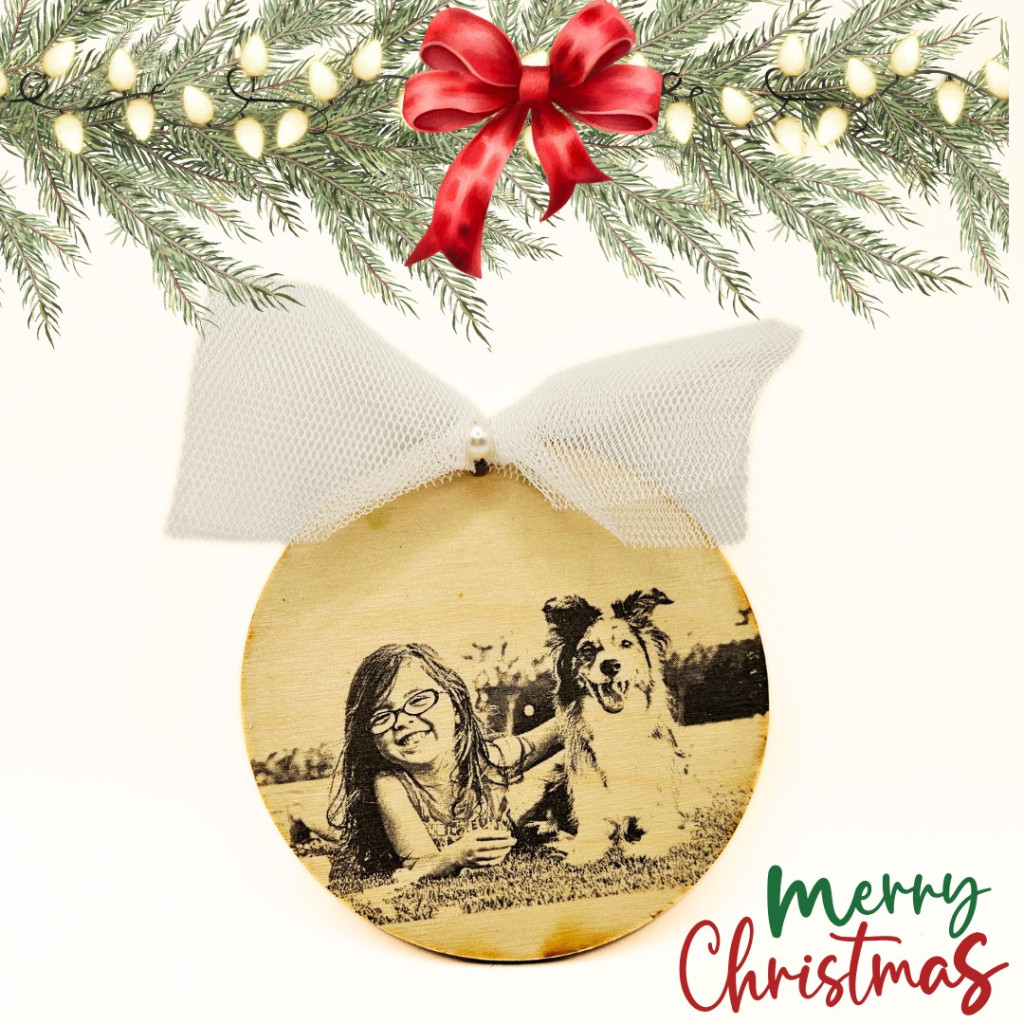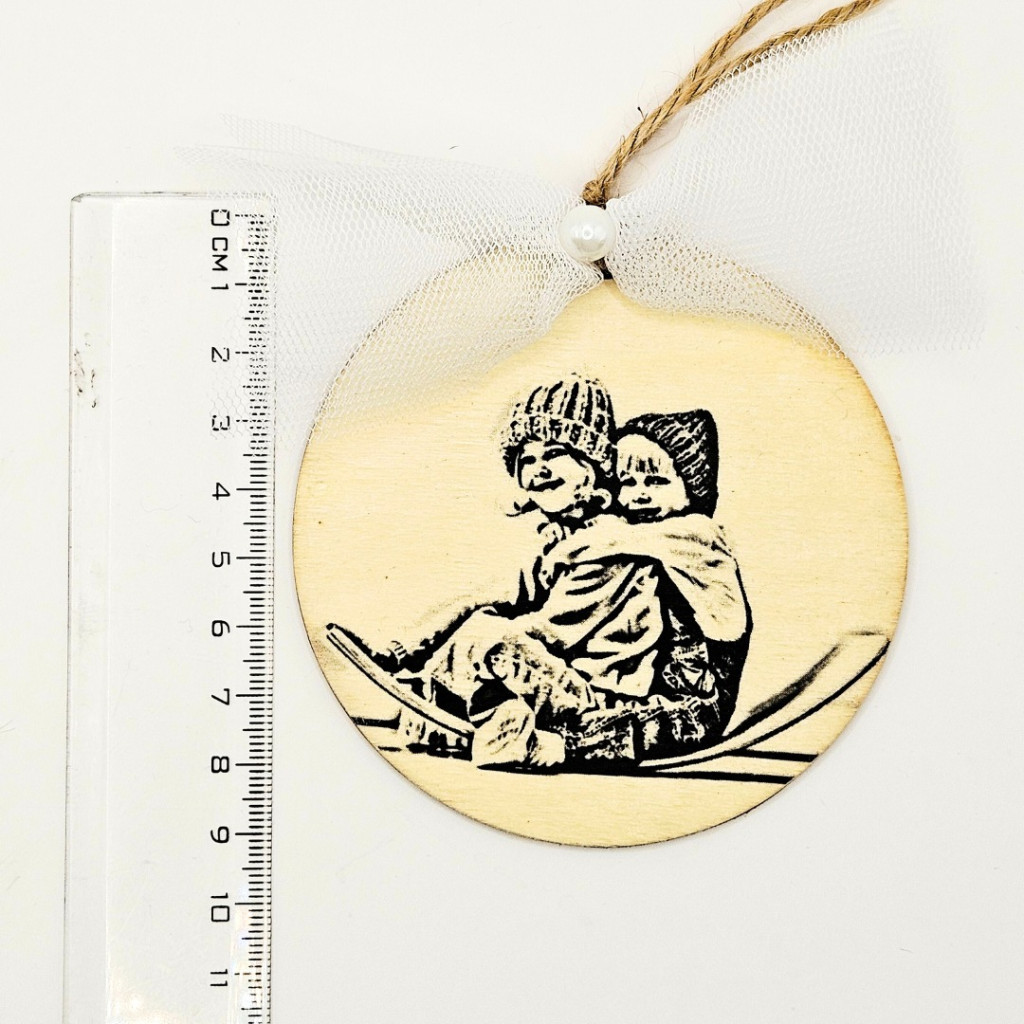 Egy egyedi karácsonyfadísz fotóval nemcsak dekoráció, hanem maradandó emlék is. A fából készült karácsonyfadísz alap természetes, meleg hatást kelt, míg a fehér tüll masni ünnepi eleganciát ad hozzá.